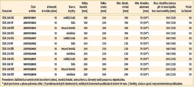 SDA = samořezný vrut s přípojným závitem M10 a drážkou Torx 25, lamelová hmoždinka Ø 10 a bezpečnostní krytka.