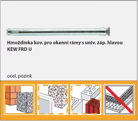 Hmoždinka kovová pro okenní rámy se smí montovat jen průstrčným způsobem montáže, tzn. připevňovaný stavební díl nesmí být mezi hlavou šroubu a okrajem hmoždinky.