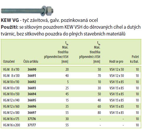 Přehled dat hmoždinek KEW pro ETICS
